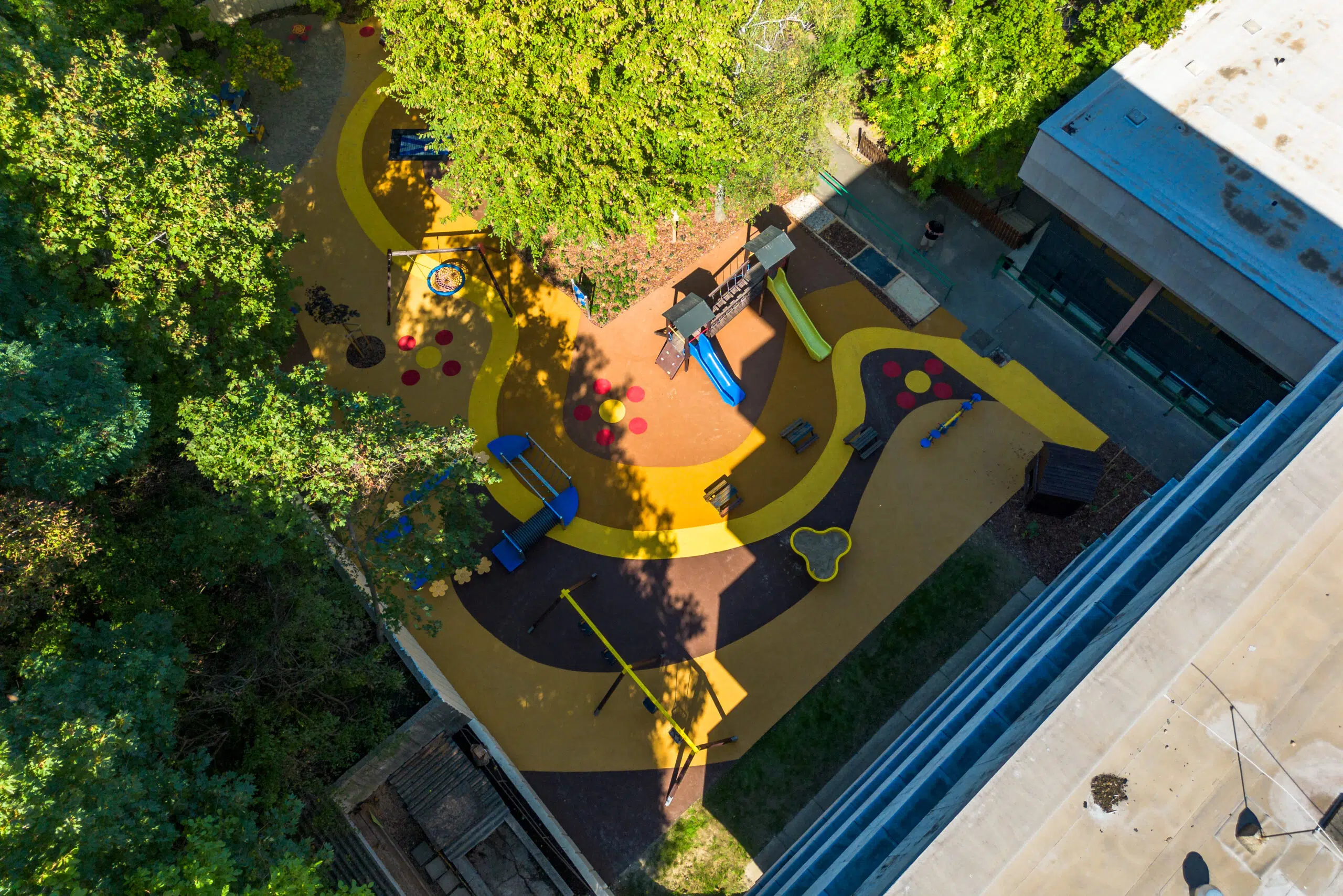 Semmelweis University – András Pető Faculty – wanted to create an inclusive playground in the institute’s courtyard that would support the development of children with different abilities and needs. The key objective was to design a space that not only enables play but also supports therapeutic processes and integrates with the character of the institutional garden.