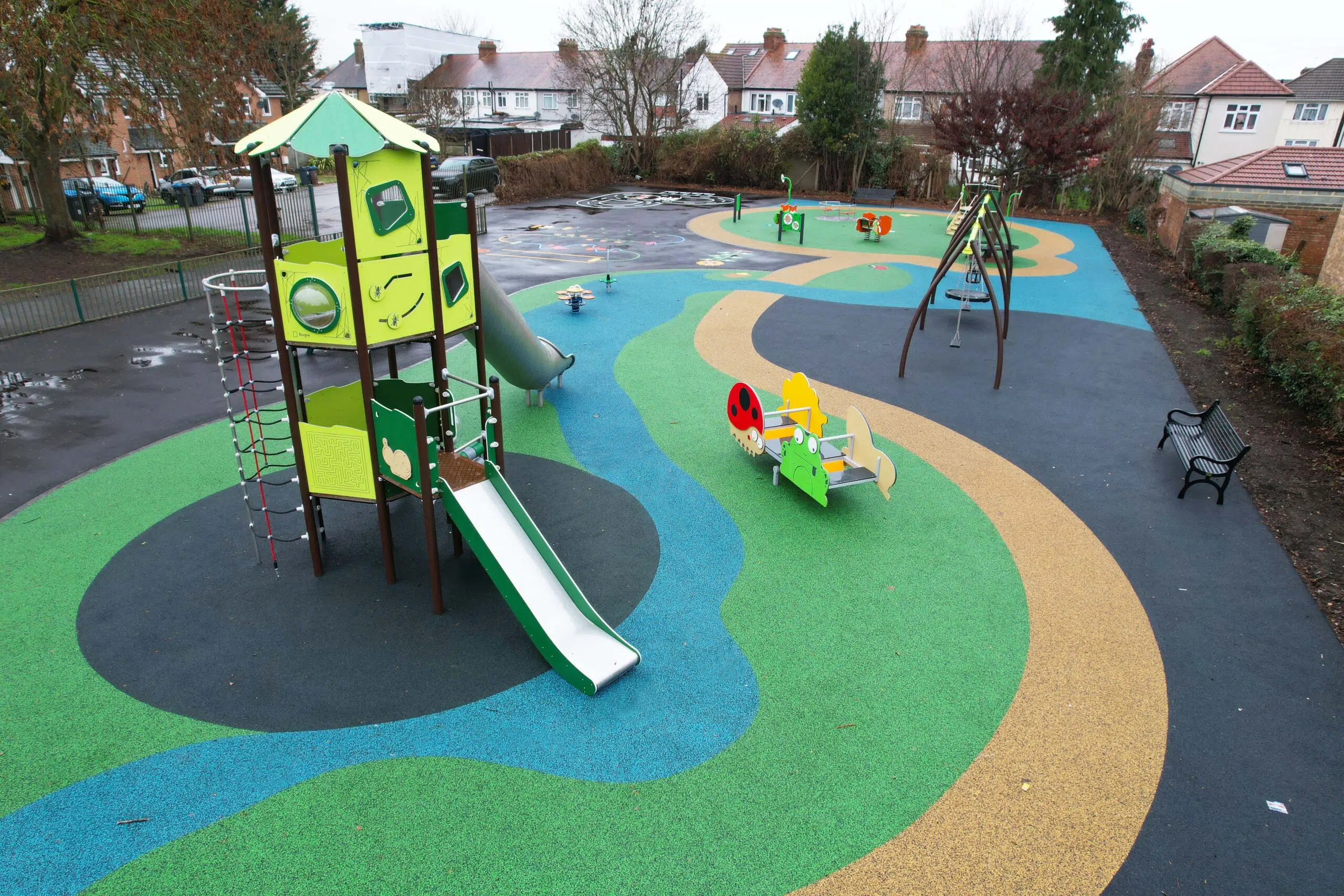 Inspired by the natural landscape of nearby Mitcham Common – a 180-hectare site of metropolitan importance for nature conservation – Active Landscapes developed a themed play area supported by a safety surface referencing the local environment. The design draws on the character of woodland trails and biodiversity, translating natural forms and textures into a coherent, attractive play space that feels rooted in its location.